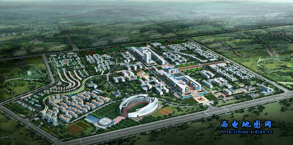 这张图是2003年新校区刚刚筹备建校时的设计图,可以看到当初的设计跟现在还是有很多不同的,还有一些建筑正在建设中,比如家属区和体育馆等。不过新校区基本就是按这个样子建造,这么一张鸟瞰图,还是挺能展现西电的